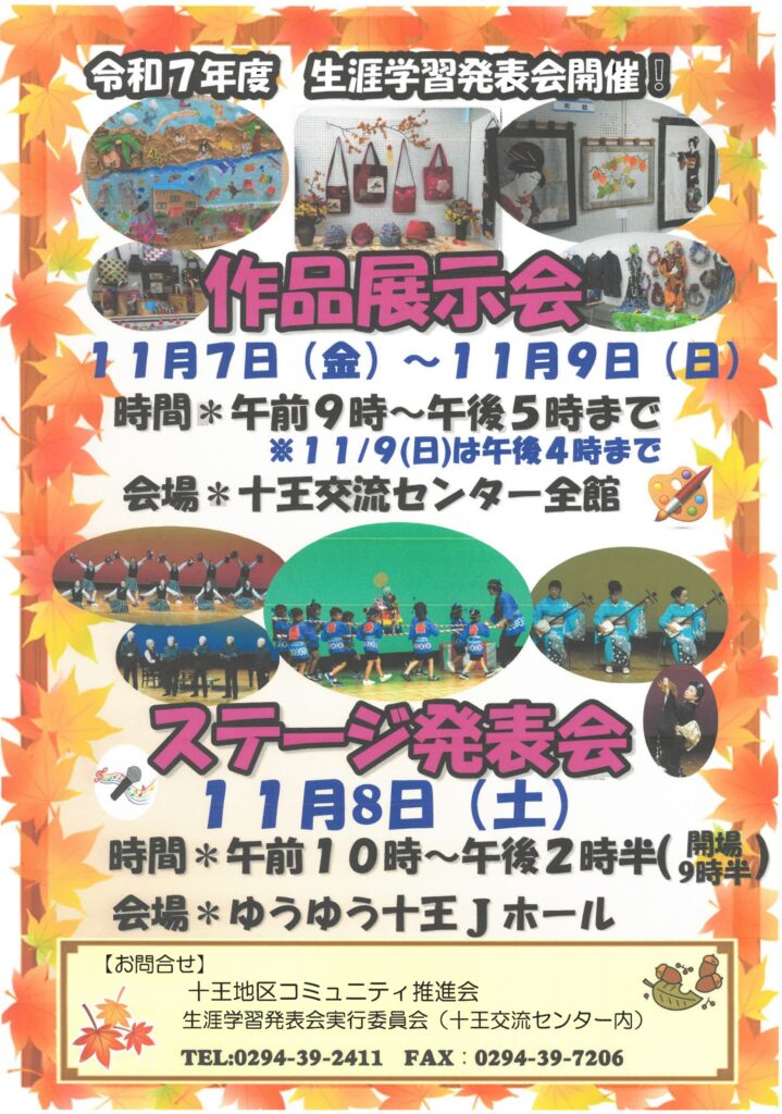 お知らせ ホーム > お知らせ一覧 > お知らせ > 十王地区生涯学習発表会開催のお知らせ お知らせ 202510.16 十王地区生涯学習発表会開催のお知らせ 令和7年度『十王地区生涯学習発表会』 多くの方のご来場をお待ちしています。 前の記事へ お知らせ一覧にもどる